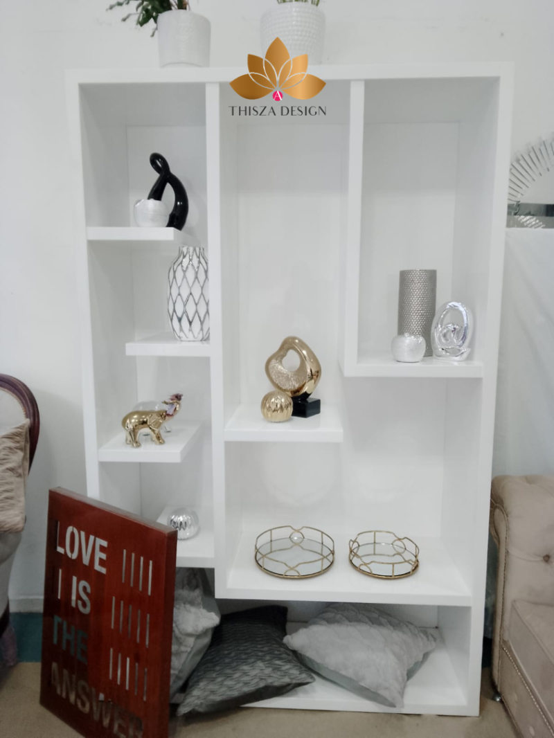 Biblioteca de madera laqueada en poliuretano blanco brillante. Diseño a medida.