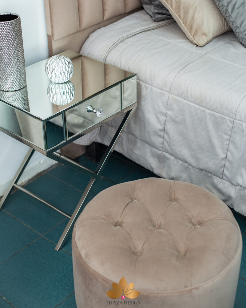 Mesas de luz espejadas biseladas y puf a pedido con tapizado con proceso antimanchas.