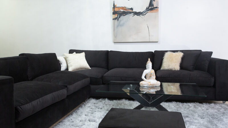 Sofá: Estructura de madera reforzada en las cuatro esquinas. Posee placa soft de 30 kg de densidad en la estructura y almohadones de vellón siliconado.